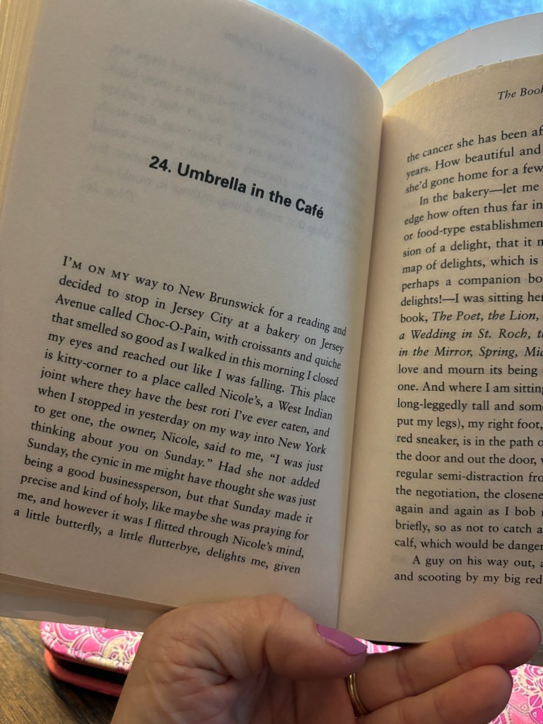 Today’s Inspiration: “The Book of Delights” by Ross Gay, a poetic journey through life’s often overlooked joys, encourages us to savor delight in our everyday lives. It’s not just perfect for moments of reflection but is also a delightful companion for my upcoming high school reunion’s theme. The essay “Umbrella in the Cafe” beautifully mirrors this rainy April morning.