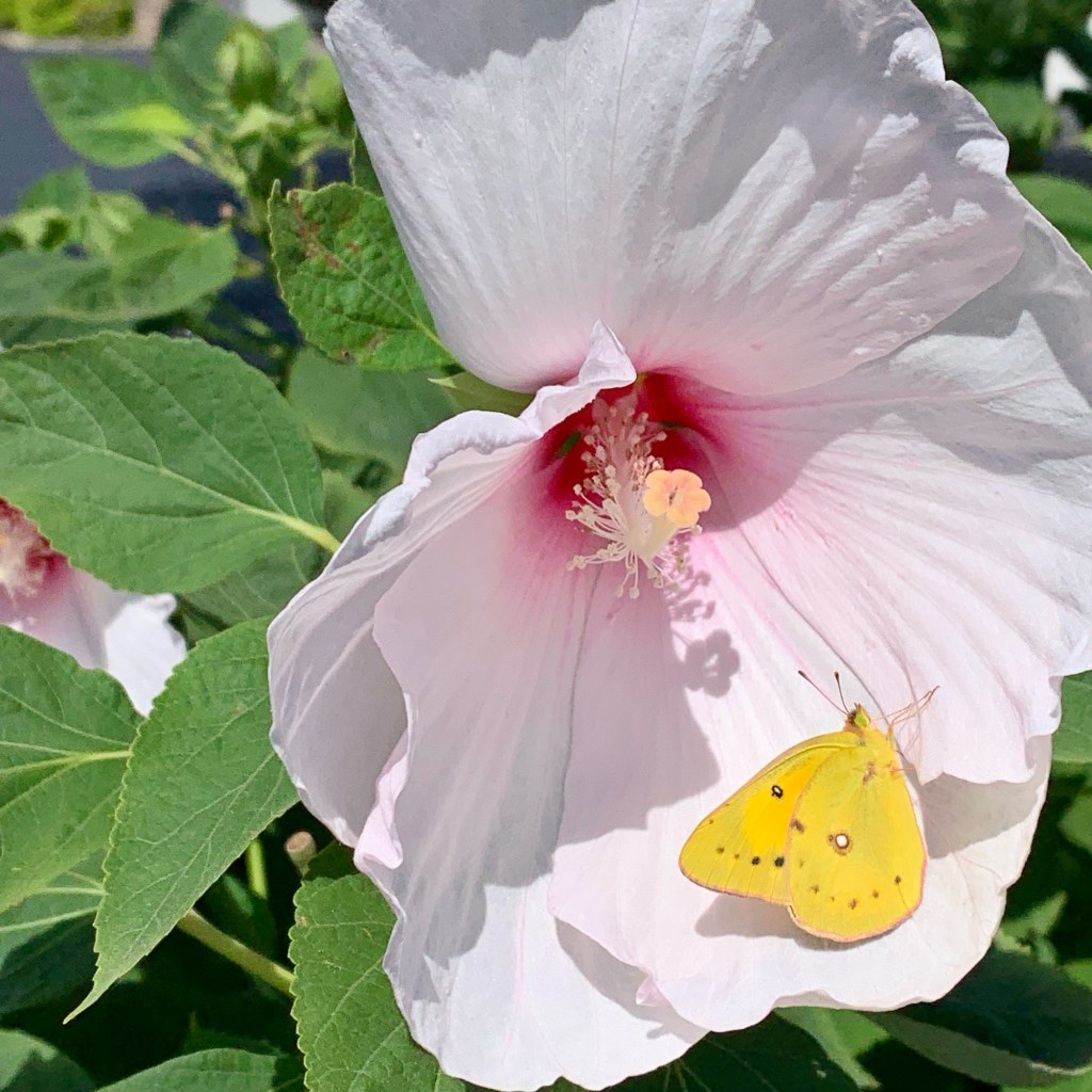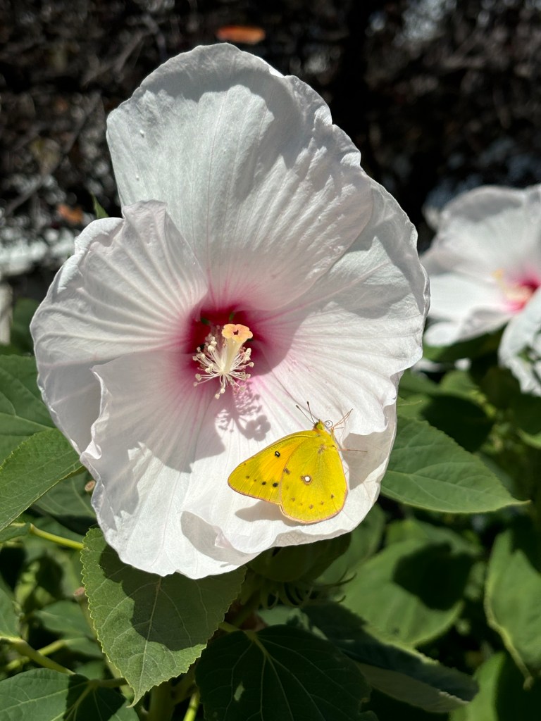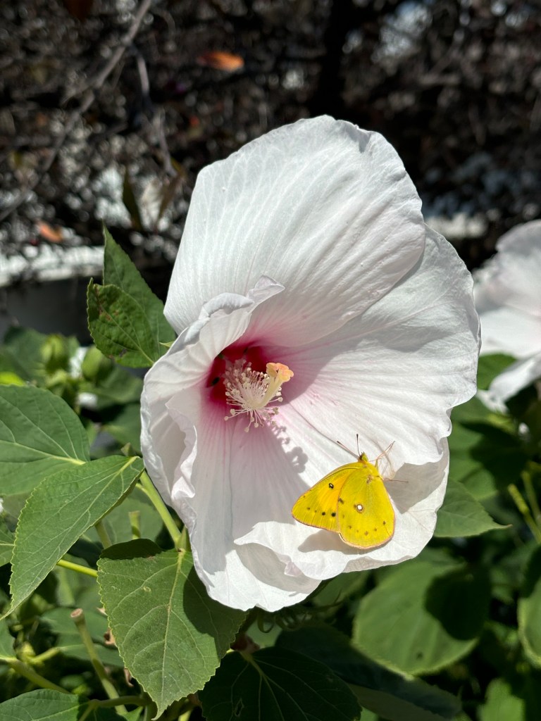 Photo collage compliments of my husband. We’re getting back to longer walks! We we’re thrilled to see this lovely butterfly perched on this large Hibiscus plant.