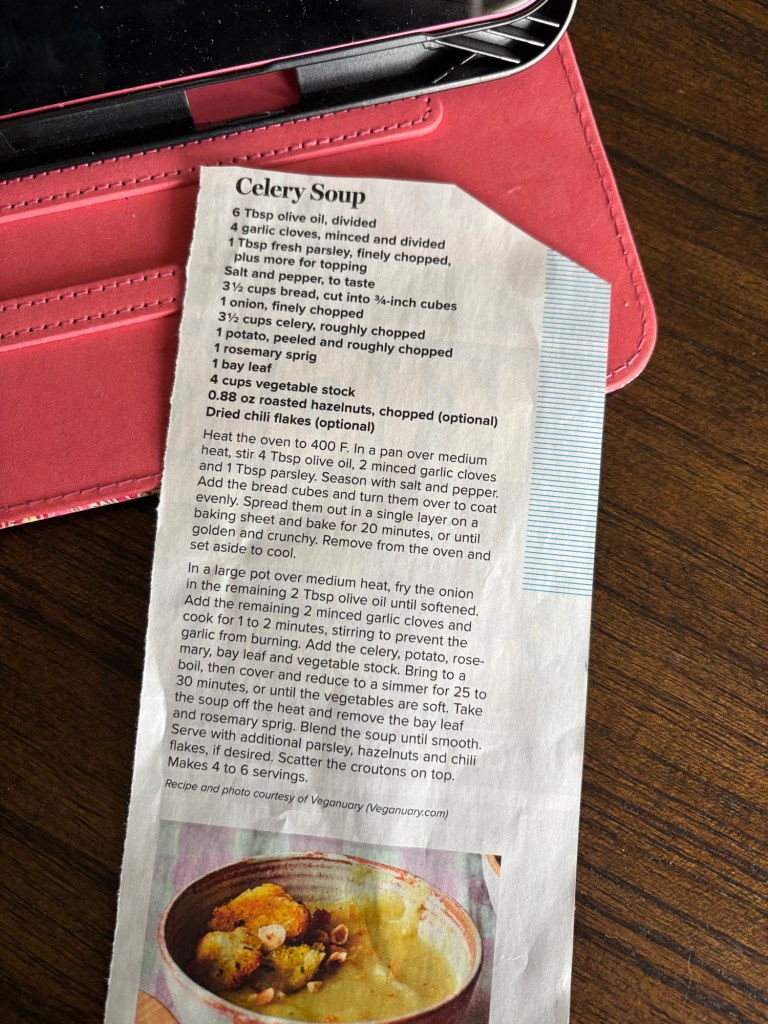 This year, my Veganuary inspiration came from an unlikely source: leftover celery. My husband, always practical, had sliced and frozen the extra celery we didn’t use during the holidays. That surplus became the foundation of a delicious Celery Soup I spotted in Costco magazine. We brought the soup to a “soup-on-Sunday” gathering, and it was a triple win: creamy (from pureeing potatoes not from dairy), comforting, and healthy.