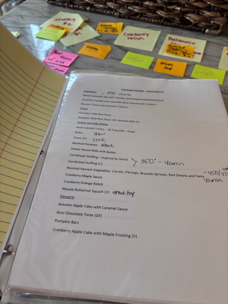 Since I wasn’t hosting that year, I played the role of collaborating on the holiday with Ginny. Katherine hadn’t experienced one of our multi-family Thanksgivings, so we explained that the meal itself isn’t “hard” — the turkey is essentially a large chicken, and the sides are comfort foods — but the variety, quantity, and timing turn it into an endurance event.
